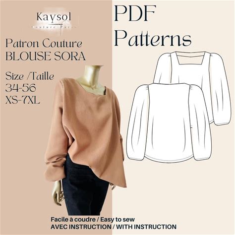PDF Square Neck Blouse Sewing Pattern Bishop Sleeve Long Sleeve Top Pdfpattern Size XS-XXXL