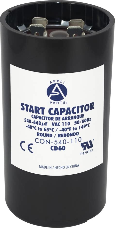 Appli Parts Motor Start Capacitor 540-648 Mfd (Microfarads) Uf 110-125 VAC Universal Fit For Electric Motor Applications 1-3/4 in Wide 3-3/8 in Height