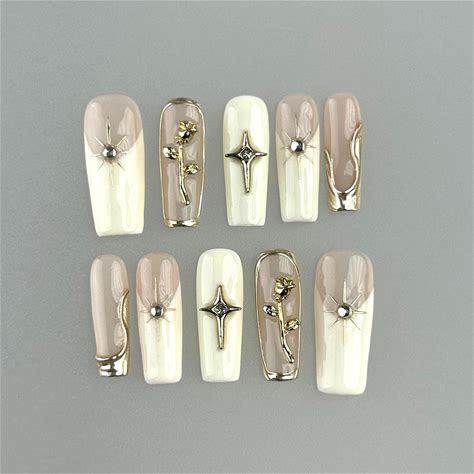 Classic White French Nail Set Nailbox White French And Gold Cross Handmade Elegant Nails, Wedding Nails, Classic Nails, Y2k Nails