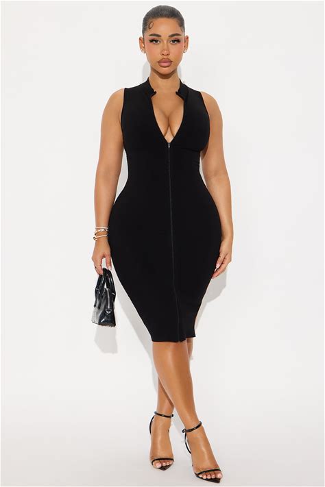 Zip Front Zipper Detail Sleeveless Snatched Mock Neck, Zoey Midi Dress In Black, Size XL, For Everyday | Fashion Nova
