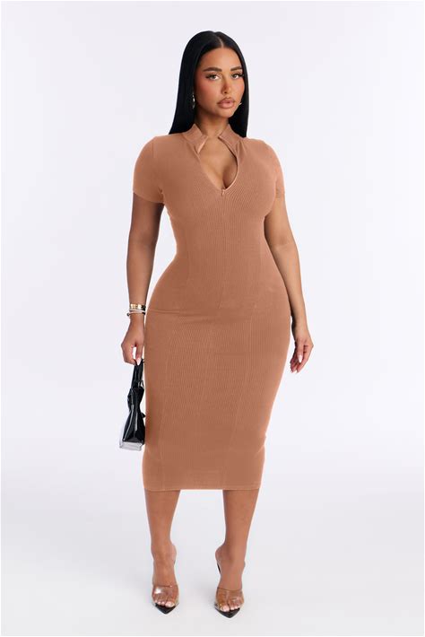 Hardware Zipper Detail Short Sleeve Snatched Mock Neck, Mia Zip Midi Dress In Nude, Size L, For Everyday | Fashion Nova
