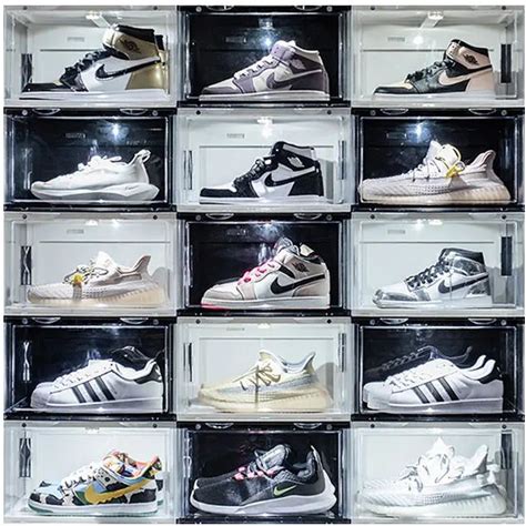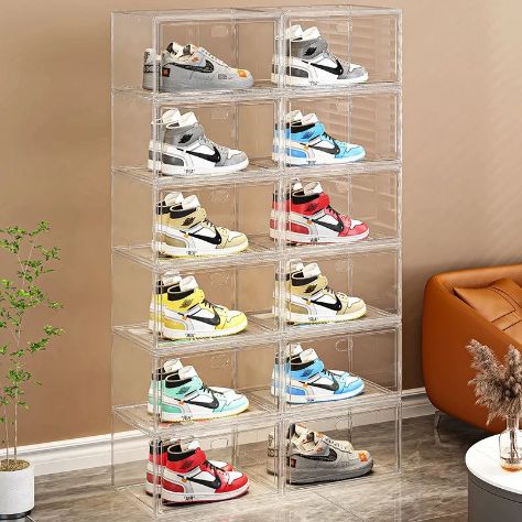 KDOR Shoe Box Clear Plastic Stackable For Sneakers,Closet,Hat. 10 Pack Sneaker Storage Boxes With Magnetic Door, Acrylic Display Case, Strong And Sturdy Fit Shoe Size Up To US 15(Black 10Pack-Side)