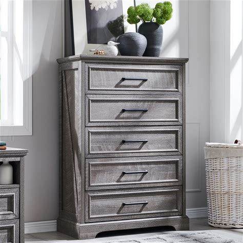 Rustic 5 Drawer Dresser Brown Barnwood Wirebrush Large Chest Of Drawers, Tall Modern Solid Wood Dresser For Bedroom, Easy Assembly, 1 Year Warranty |