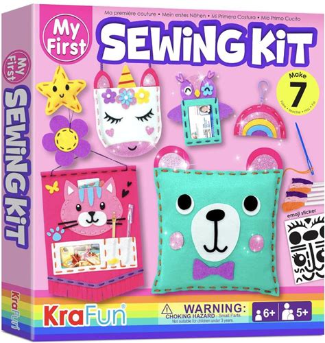 KRAFUN My First Sewing Kit For Beginner Kids Arts & Crafts, 7 Easy DIY Projects Of Stuffed Animal Dolls And Plush Pillow Craft, Instructions & Felt,